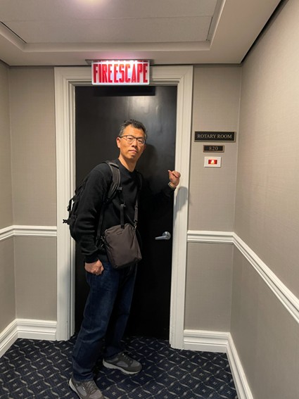 少し拍子抜けしましたが、それでも部屋の前で記念撮影。ロータリークラブがここから始まり、今や世界規模の組織になったことを考えると、感慨深いものがありました。